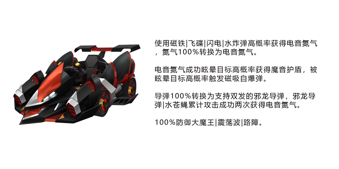 不过只有一次碰撞怎么能算华丽的谢幕呢?被眩晕的目标还将高概率触发磁吸自爆弹,倒计时后形成爆炸,将范围内赛车禁锢,整片区域划为禁行区!导弹加强为邪龙导弹,一次双发,两次攻击成功再次聚能电音氮气,引动新一轮震荡与封锁。