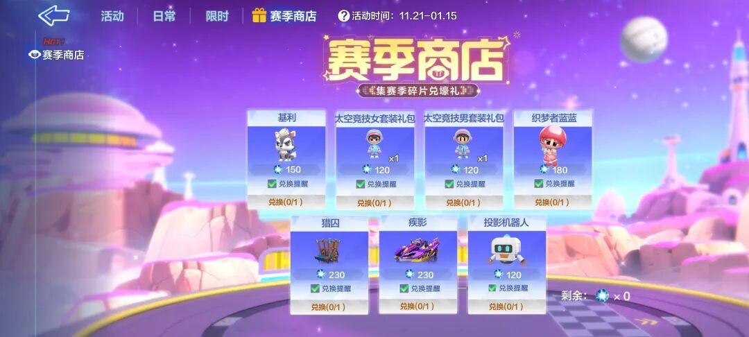 明月高悬星河无际,破开木制的窗,在梦境里触摸夜色与回忆。11月21日,新一期赛季商店正式开启,全新传说道具车【猎囚】上架,太空竞技套装、织梦者蓝蓝、投影机器人……品类丰富,多款经典道具返场,参与完成整个赛季历程内各大任务即可获取赛季碎片免费兑换自己喜爱的道具!