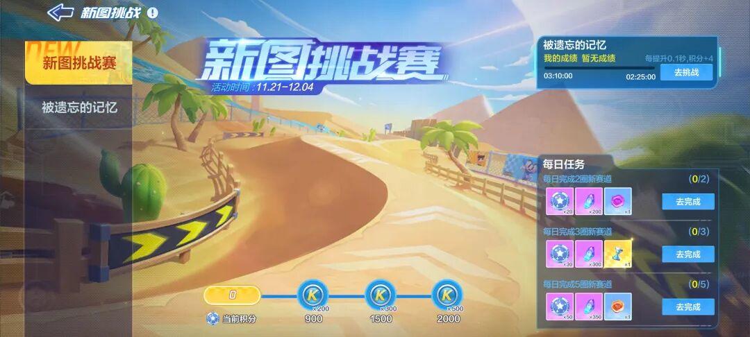 11月21日-12月4日还将开启新图挑战赛,车友们完成新图挑战,即可获得奖励和积分。奖励包括时间沙漏、紫色幸运币和橙色幸运币,其中积分可用于兑换酷币。