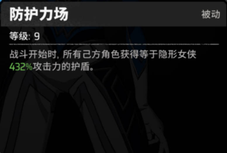 战斗开始时。所有角色获得等于隐形女432%攻击力的护盾。