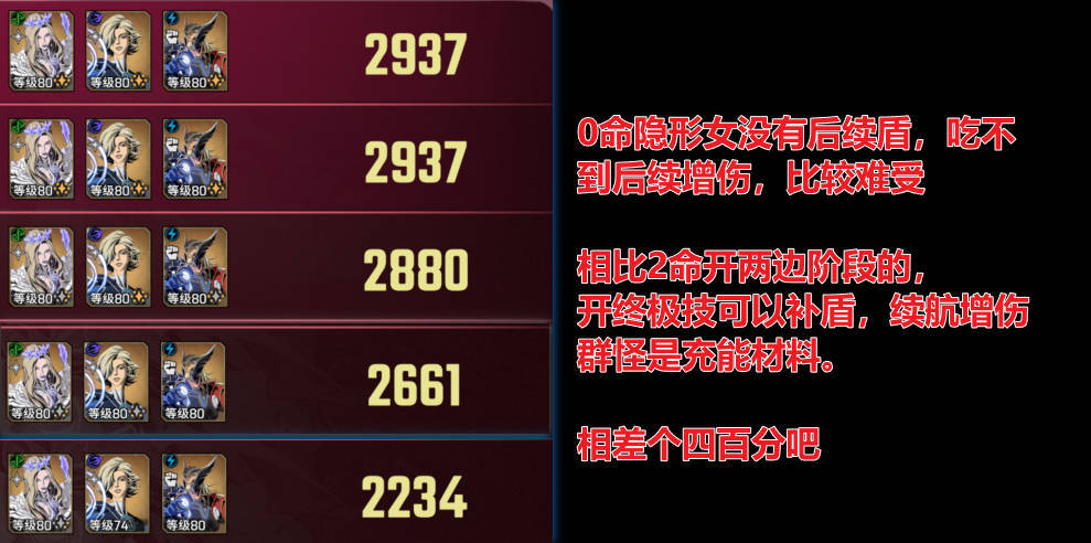 最后是你要么升到完全体要么就2命,最多允许4命两边2开,因为每条路线的三性价比都不是很高,你四侠练度低升【心灵3】日后发觉很亏,而【理智3】范围怪少,没有太大增益明显,直到完全体【灵魂】后,终极技伤害提高40%,隐形女才有提升上限。