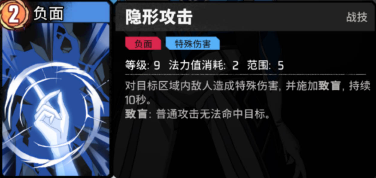 小范围、伤害中等,重点是持续10秒的致盲负面,能让状态的普攻无法命中目标,你可以攻击到伤害肯定是闪避的,非常克制射手与战士的普攻,目前版本是没有克制的,到未来版本[夜魔侠]的被动免疫致盲以及‘必定命中’字眼说明了后续会有这类英雄设定,但短期肯定是没有。