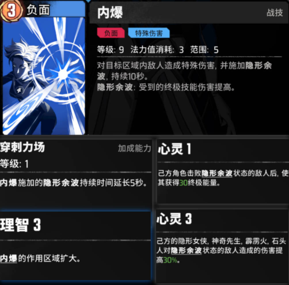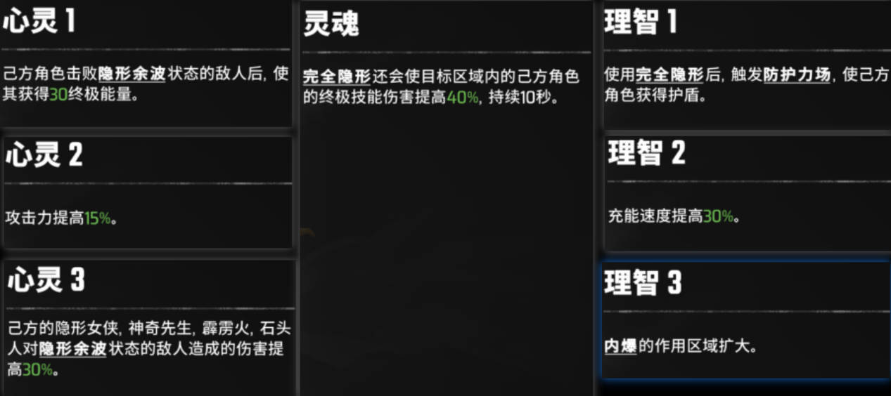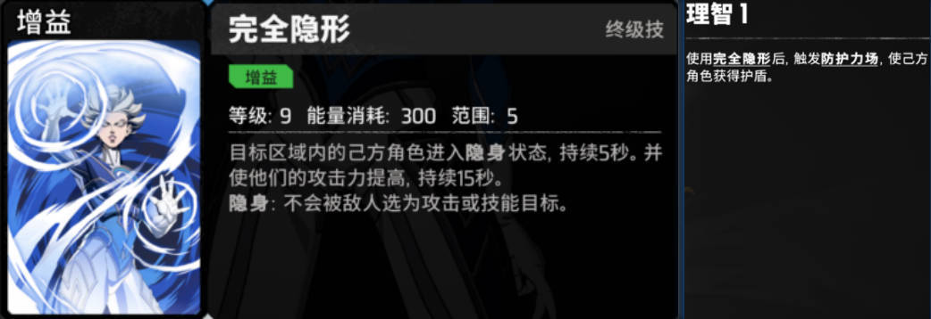 解锁【理智1】使用终极技后,触发被动技,被动技能就是给予护盾,是隐形女战斗中给队友获得护盾的重要途径!不能只单靠先机,过程也很重要。