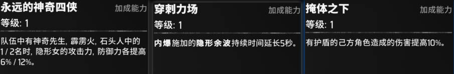 21级解锁天赋【永远的神奇四侠】神奇四侠固定特有天赋,神奇四侠越多增幅越高,每一名攻击与防御提高6%,上限12%,所以至少要一名不然这天赋就成0了,石头人与神奇先生这两位考虑一位即可。