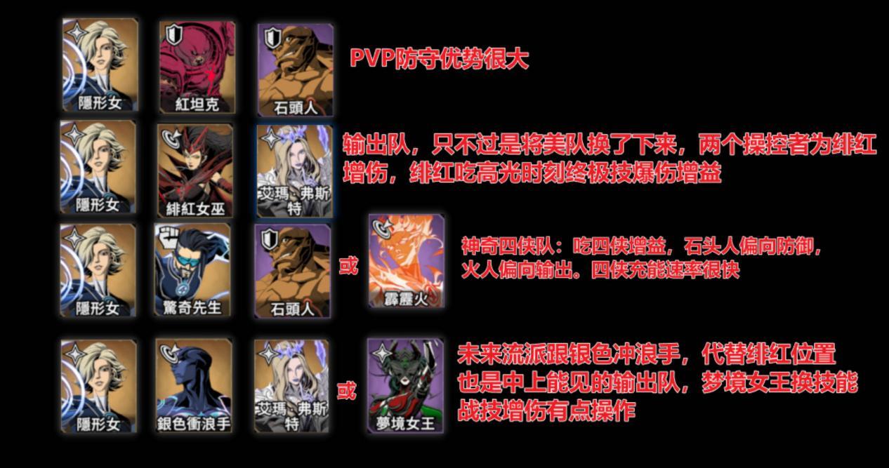 下面如果你没有特殊伤害角色,类似钢铁侠也能组,毕竟隐形女增益是全面的,不选择类型伤害,[隐形女]+[钢铁侠]+[美队]不过后面美队还在,钢铁侠却被换得多。