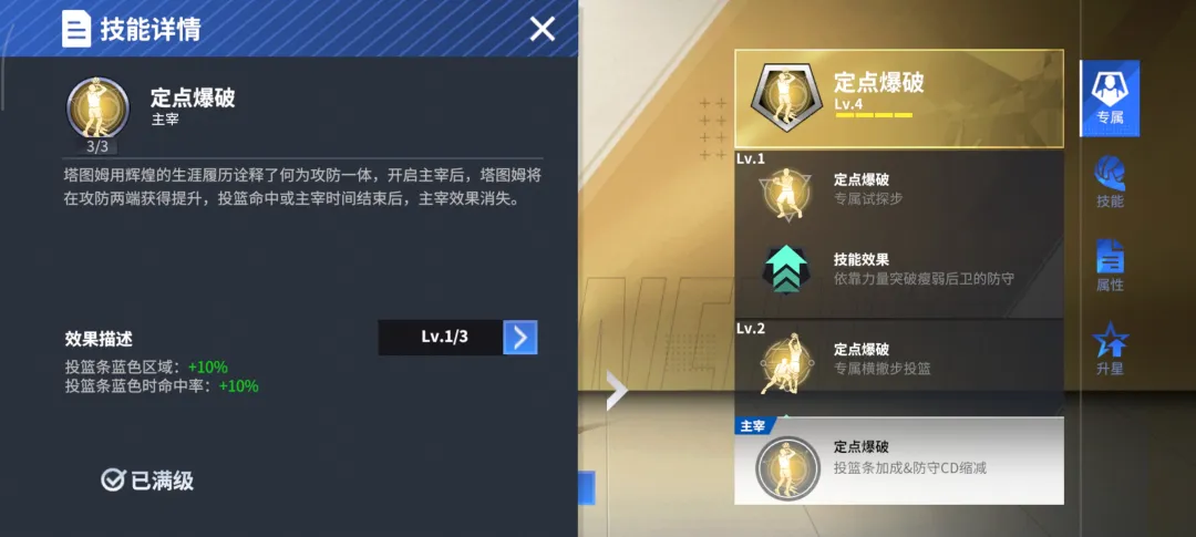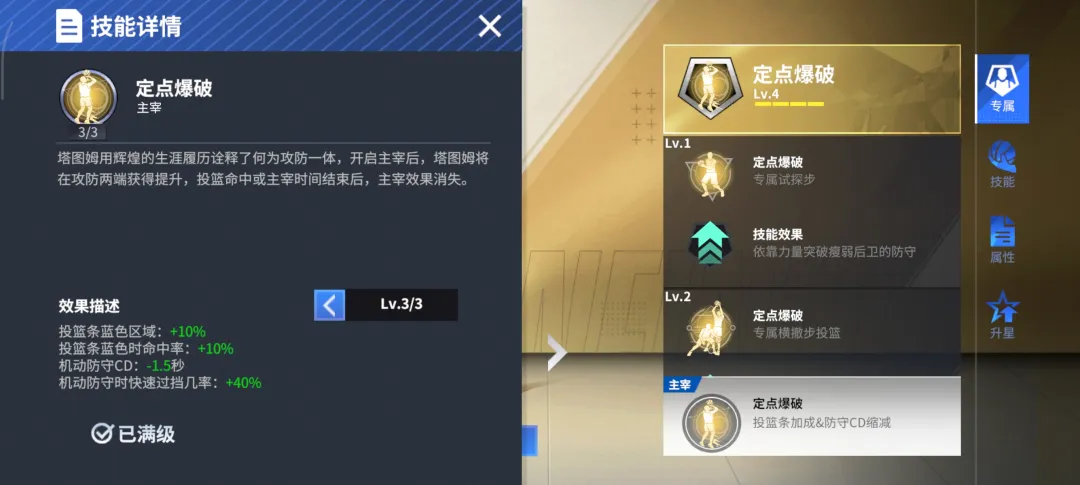 3级:开启主宰后,塔图姆投篮条蓝色区域将扩大10%,投篮条位于蓝色区域时,塔图姆获得10%的空位投篮命中率加成,投篮命中后主宰结束;机动防守CD-1.5s,在机动防守激活时,塔图姆快速过挡的概率+40%。