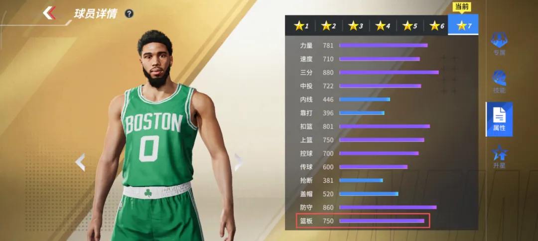 三、属性&技能调整(在24/25赛季中,塔图姆的防守篮板率排名联盟第18位,在锋线摇摆人中遥遥领先)