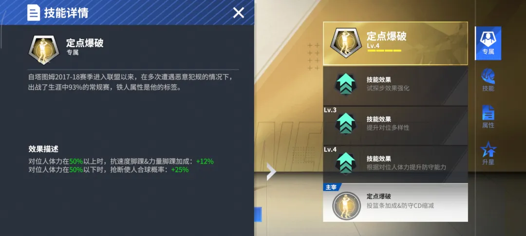 现专属:对位人体力在50%以上时,塔图姆获得12%的抗速度脚踝&力量脚踝加成;对位人体力小于或等于50%时,塔图姆获得25%的抢断使人合球概率。