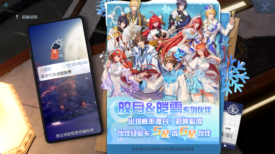 月照银雪,漫夜流光,久别的伙伴呼唤着昔日的冒险,等待冬夜的再度启程。11月20日10时~11月26日24时,伙伴招募限时开启周年庆特典卡池!卡池消耗特殊指令“灵魂链接”,单次招募必得伙伴经验卡、5星伙伴或任意皎月、皑雪系列伙伴之一。活动为期仅一周,活动期内每天可以抽奖100次,万勿错过哦!