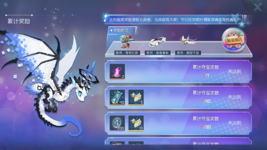 累计扭蛋次数可领取返场源魂座驾自选、时光座驾碎片、虚像结晶、幻视结晶、重构晶格、梦幻手办匣、诫律重塑道具、金色龙裔技能等珍稀奖励,集齐一定数量的时光座驾碎片可兑换当期扭蛋机座驾「本期限时返场的源魂座驾除外」,每期活动会重置扭蛋的次数和累计奖励,但时光座驾碎片可长期获得和使用!本期兑换商店限时新增座驾自选礼,快来体验吧!