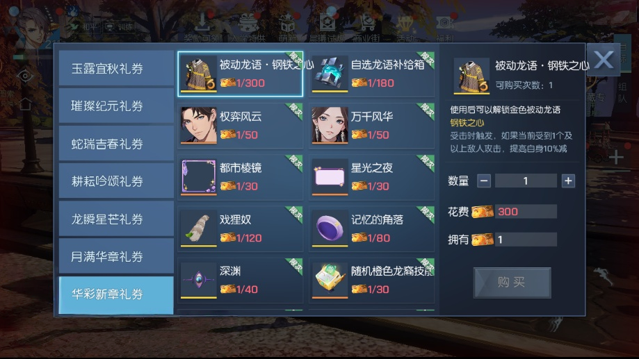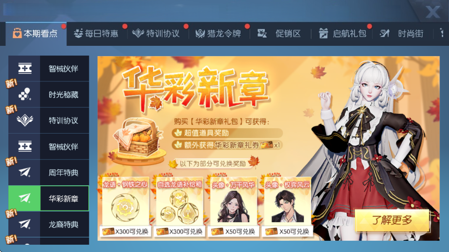 华彩新章礼包将于11月20日在商业街-商区-促销区中上架,购买华彩新章礼包使用后可获得丰厚的珍稀道具奖励以及华彩新章礼券,华彩新章礼券可兑换龙语·钢铁之心、还可6折兑换自选龙语补给箱(包含返场龙语·以战止戈、返场龙语·鸾吟穹阙、返场龙语·游鳞献瑞)、头像·万千风华、头像·权弈风云、头像框·都市棱镜、聊天气泡·星光之夜等奖励!更有惊喜返场背饰·戏狸奴、返场头饰·记忆的角落、返场面饰·深渊可以8折兑换!