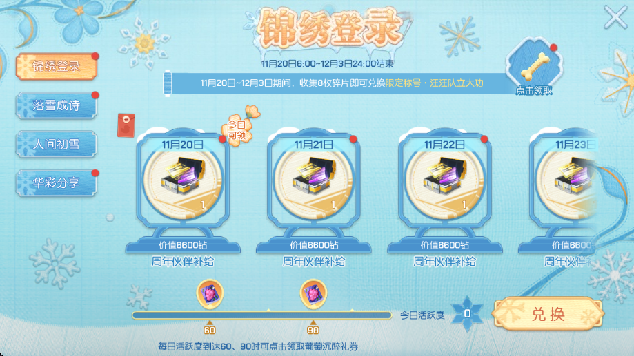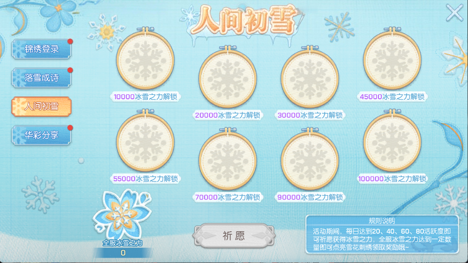 雪落人间,锦绣天下。11月20日6:00~12月3日24:00,每日达到20、40、60、80活跃度即可参与祈愿获得冰雪之力,还有机会获得经验、金币、落雪暖绒礼盒、葡萄沉醉礼券、光影粒子、微光晨露、龙威铸铁、神秘圣印宝匣等祈愿奖励。