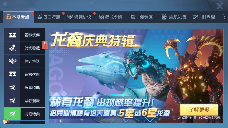 龙裔特典卡池将在11月20日10时~11月26日24时限时开放!卡池奖励全新升级,五星龙裔与六星龙裔概率超绝up,活动为期仅一周,活动期内每天可以招募100次,万勿错过哦!