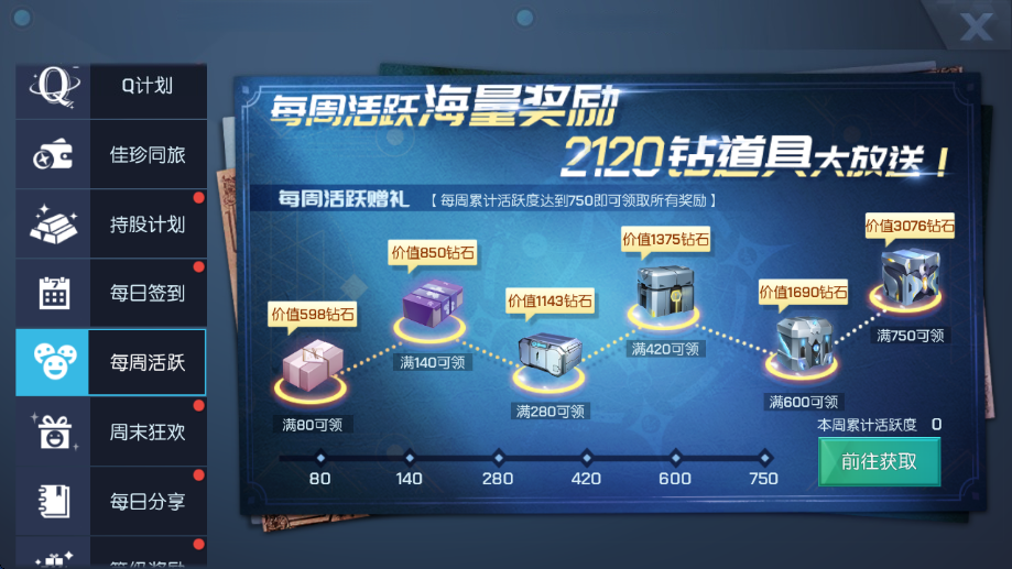 每周活跃奖励基础提升,活跃度达到280有10%概率额外获得颜料卡礼盒(可交易),活跃度达到600有3%概率获得随机橙色龙语装备(可交易)、活跃度达到750有10%概率获得随机橙色龙语装备(可交易)。