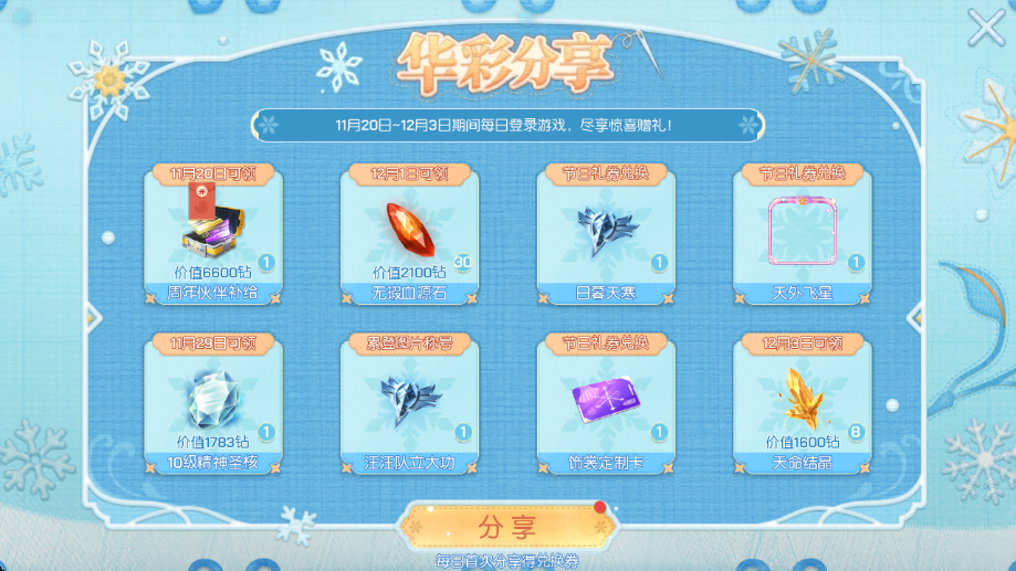 全服冰雪之力累计达到一定数量即可点亮雪花刺绣,有机会获得昼影流金、饰裳定制卡、回声序列、神秘高阶圣印宝匣、随机高阶星盘盒、华彩新章礼包、限定头像·汪星来电、上古符咒断章等好礼哟~