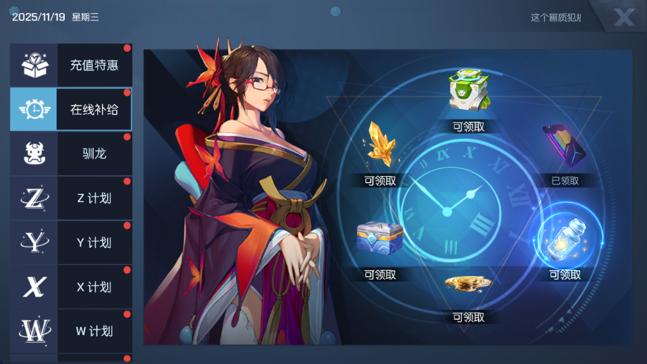 在线补给奖励基础提升,在线90分钟的补给中有概率开出时光印记II、随机橙色龙语装备(可交易)、游戏达人套组、颜料卡礼盒(可交易)等奖励。