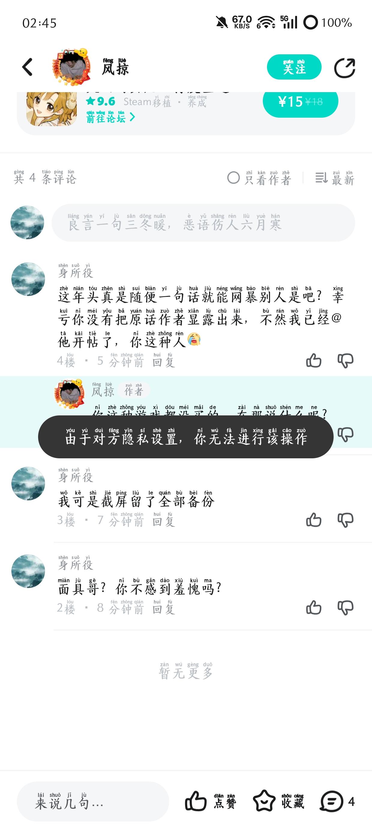 “游戏都没买,你有什么资格讲话!”来自本论坛“未知生物”,暂且称为“面具哥”,下列缘由图片,或者直接划到最后。