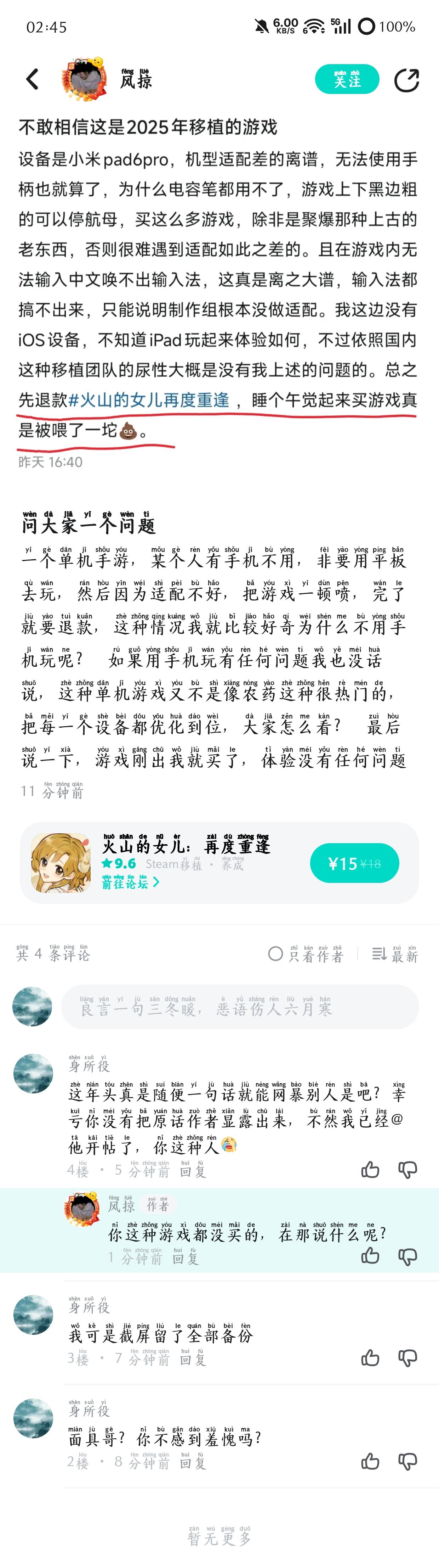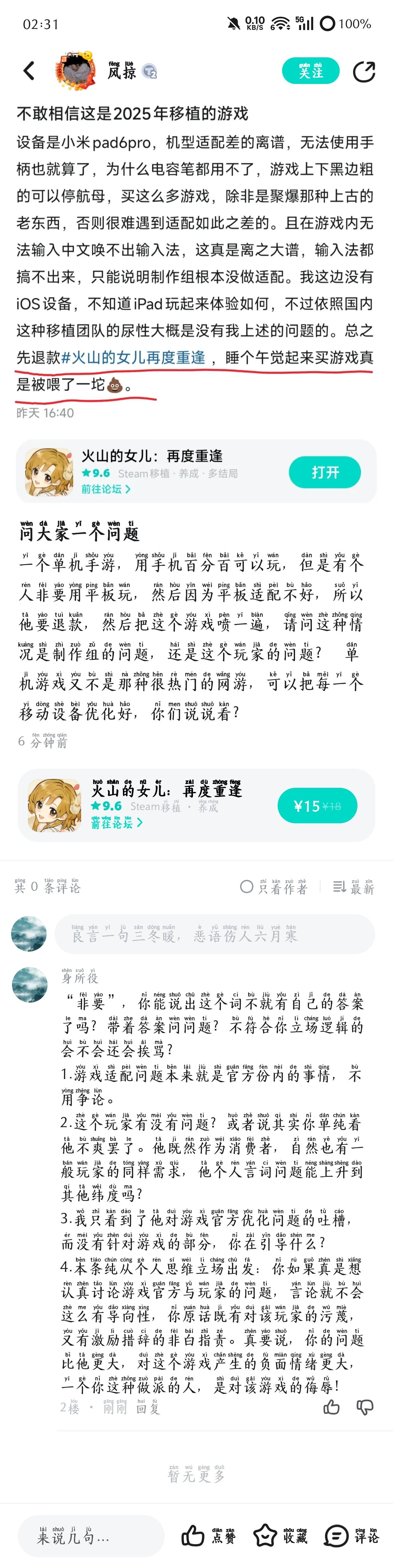游戏移植,暂且不论全面适配掌机和移动端的ios/安卓,就单说安卓移植,这是默认的公识吧?怎么?安卓平板就不是安卓?平板的适配问题就不是问题?平板用户有问题不能反馈?有问题措辞带了情绪就得被无端指责和污蔑?咱论坛平板用户不会太多,但也不是没有吧!那平板用户的体验你负责?你是啥?你只顾着自己那张嘴爽了?只顾着自己的主观臆断,情绪发泄了?这年头造谣很轻松是吧?污蔑别人,无端指责别人,网爆别人很简单是不是,三言两语就能被你定性是吧!我真不知道你是什么“人”