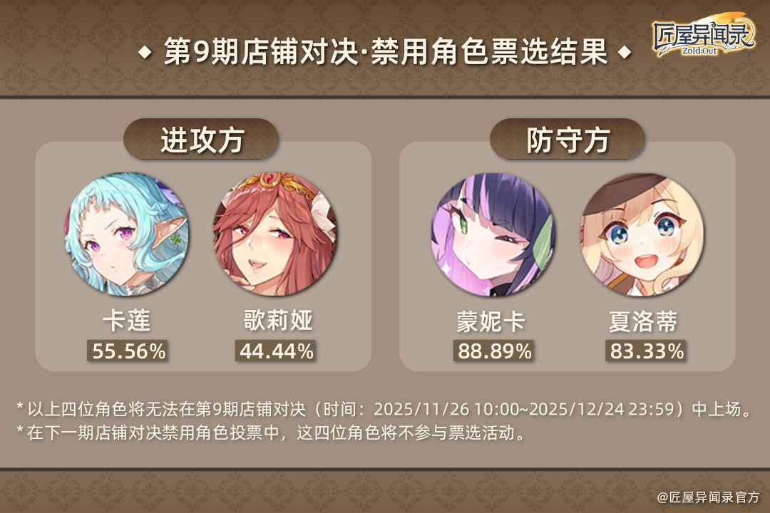 第9期店铺对决禁用角色票选活动已截止,投票结果新鲜出炉啦~