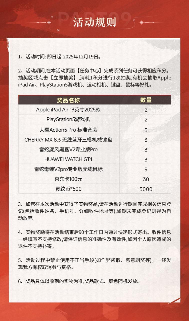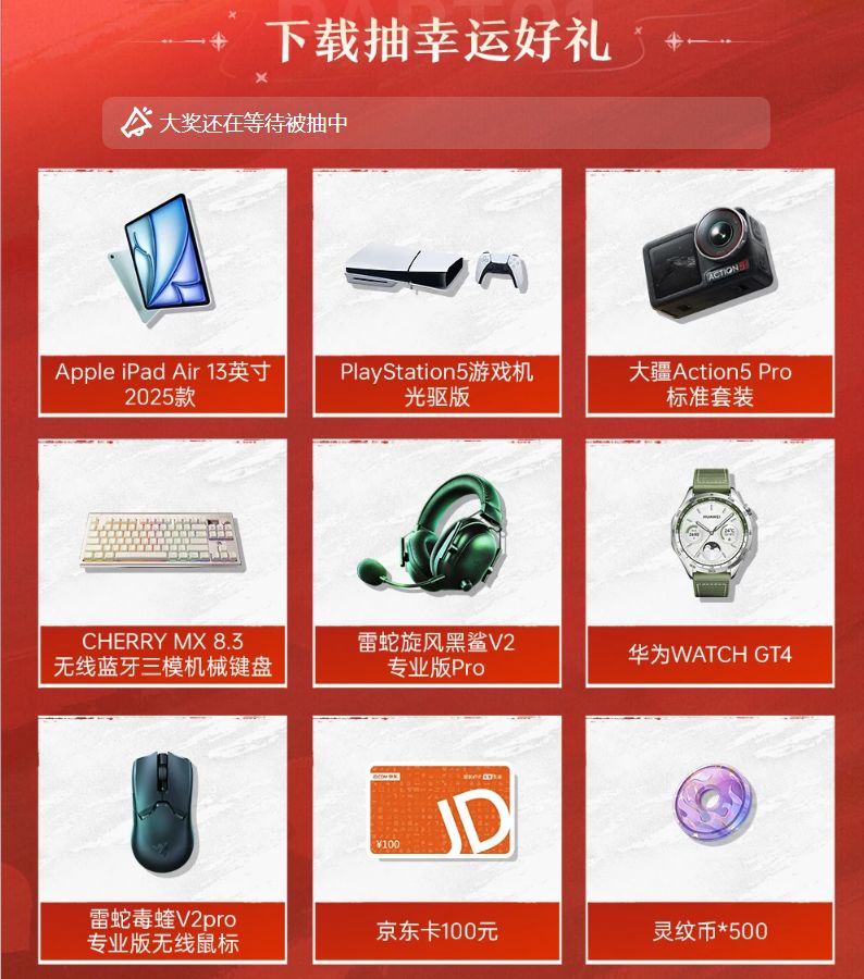 11月21日9:00公测正式开启,现在下载游戏就有机会赢iPad Air、PS5、大疆Action5 Pro 等豪礼!