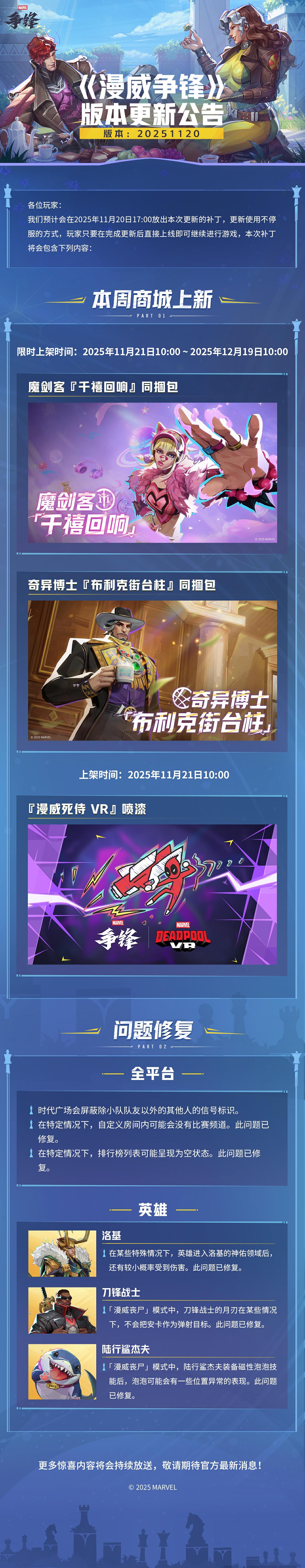 我们预计会在2025年11月20日17:00放出本次更新的补丁,更新使用不停服的方式,玩家只要在完成更新后直接上线即可继续进行游戏,本次补丁将会包含下列内容: