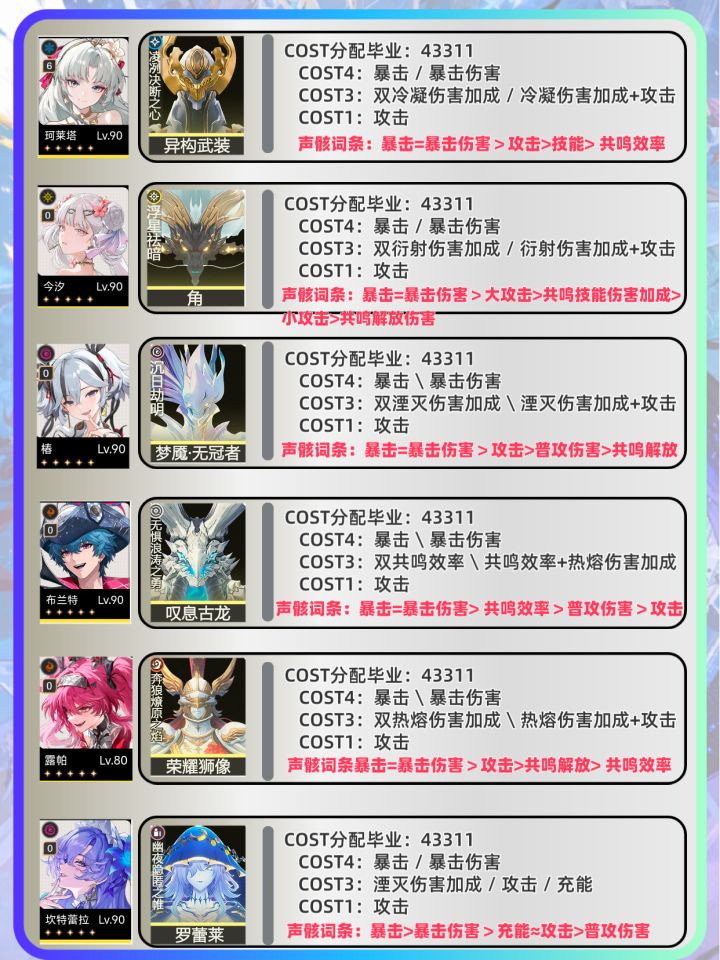 暴击=暴击伤害>攻击>共鸣解放> 共鸣效率(推荐效率120%以上)