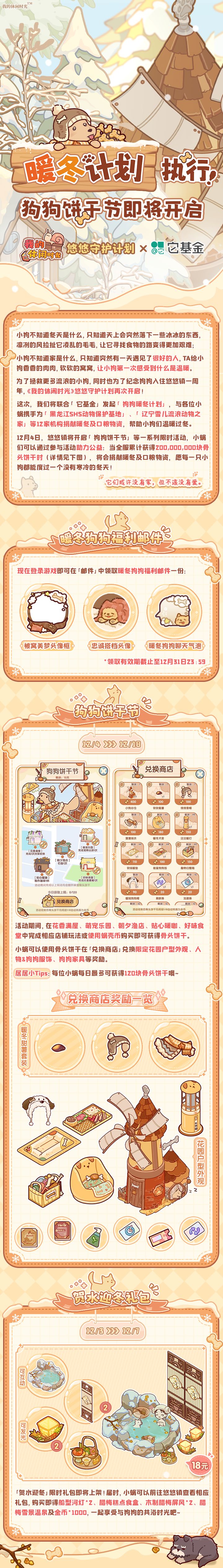 为了帮助更多狗狗度过一个温暖的冬天,悠悠镇开展的「暖冬计划」在今天正式启动啦!12月4日,「狗狗饼干节」暖心开启,完成地图店铺相应玩法即可获得骨头饼干助力公益,现在回悠悠镇还可以在「邮件」中领取狗狗主题限定头像&头像框、聊天气泡的纪念礼物一份哦~