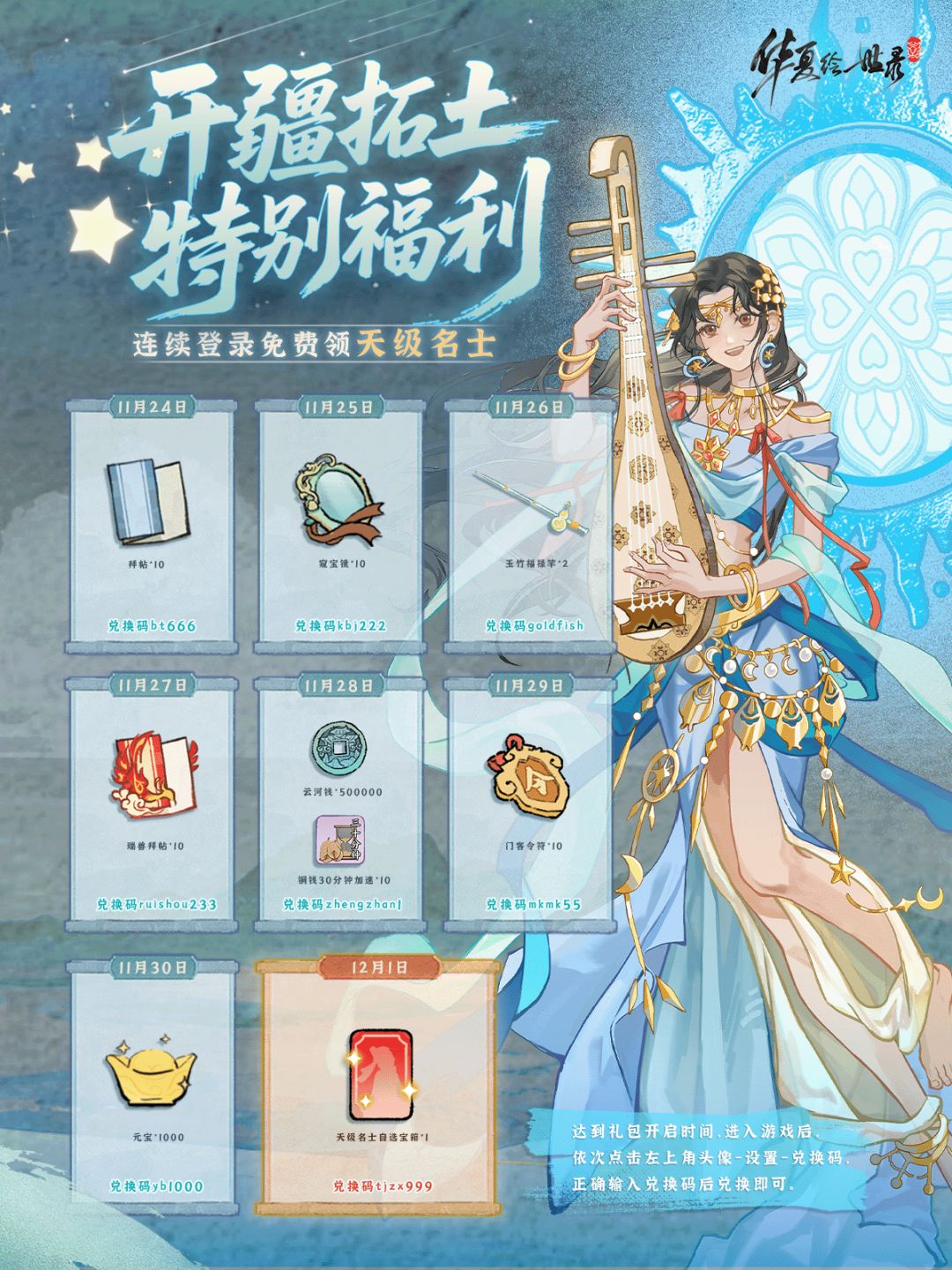 11月24日 - 12月1日,每日登录兑换限定福利码,8 天福利层层升级,从海量道具到终极大奖天级名士自选宝箱,通通都有!