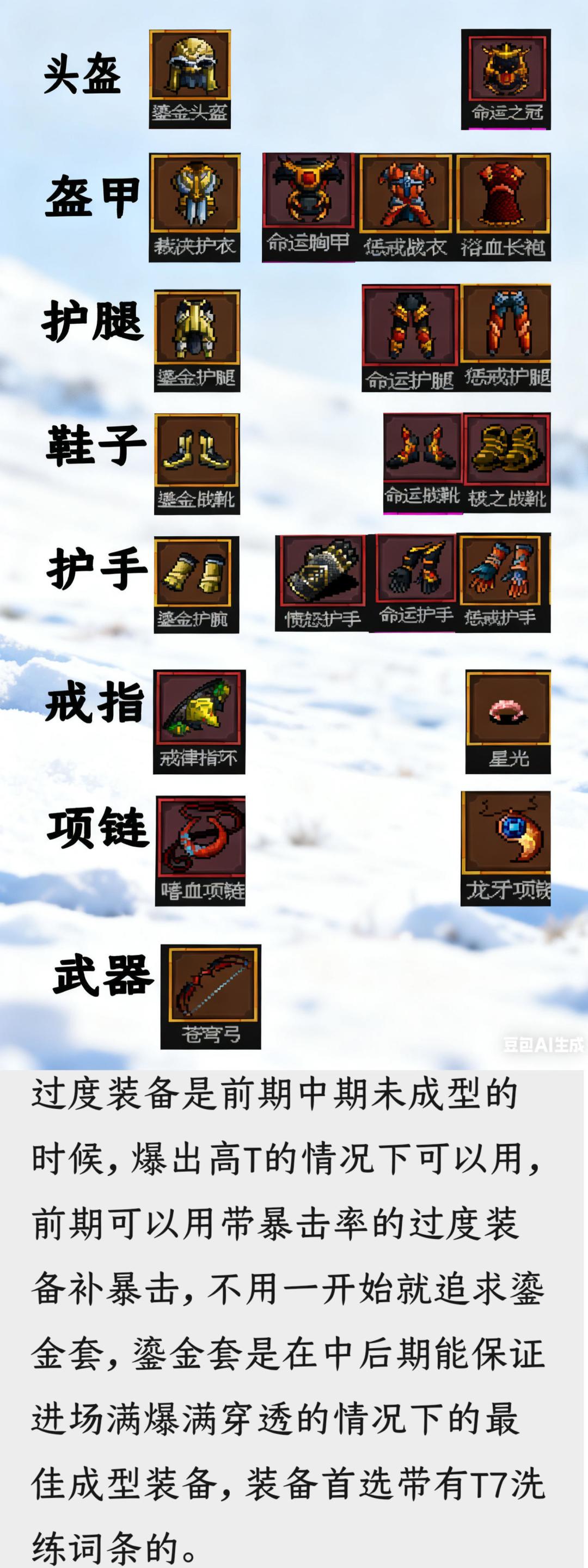 过度装备是前期中期未成型的时候,爆出高T的情况下可以用,前期可以用带暴击率的过度装备补暴击,不用一开始就追求鎏金套,鎏金套是在中后期能保证进场满爆满穿透的情况下的最佳成型装备,装备首选带有T7洗练词条的。