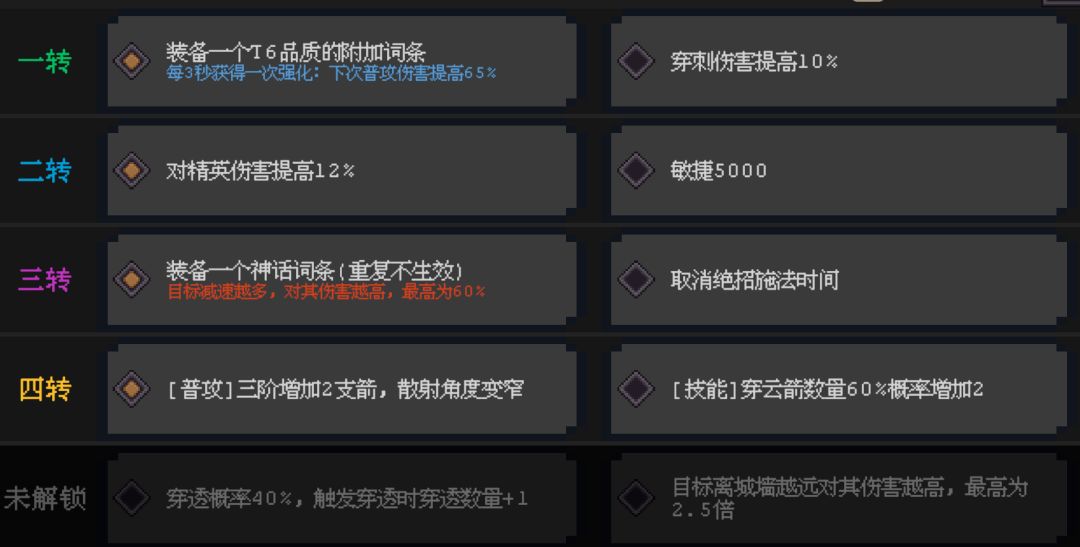 1转必选3秒强化普攻,2转前期可以选5000敏捷,中后期改精英怪伤害12%,神鹰1转、4转、5转都是质变。