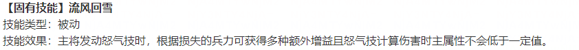 她的固有技能是【流风回雪】,是一个补强怒气队的被动技能。从之前爆料的数值来看,还是有上场的机会的,不过枪兵适性只有良,会导致其作为项羽枪队的副将时,部队的移速下降,影响其拉扯和生存能力。目前来看最优解是作为项羽骑的副将。当然如果没有项羽的朋友,也可以用她当苏定方的副将,玩怒气骑或者怒气刀。