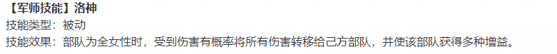 她的军师技师洛神,这个技能看起来有点鸡肋,首先是全女性将的队伍本身就没有什么强度,唯二的输出将的吕雉和穆桂英,输出都不是第一梯队的。其次如果伤害转移给肉队的话,那么肉队获得了增益也打不出输出,但伤害转移给了输出队的话,虽然获得了增益,但降低了兵力,还是变相降低了输出。唯一能想到的用法就是搭配杨玉环、樊梨花或者是箫绰站在旁边当光环和辅助了。不过值得注意的是,这个技能是王于首次引入这种“伤害转移”机制,而且是在军师位引入这个机制,打破了以往军师位只有简单的增减伤的情况,猜测未来在军师位放入更多的机制,也是一个技能设计的方向吧。