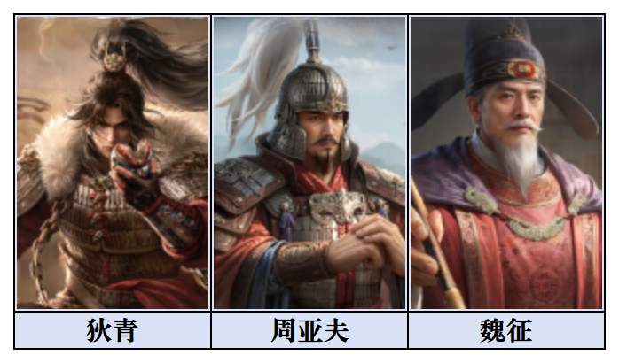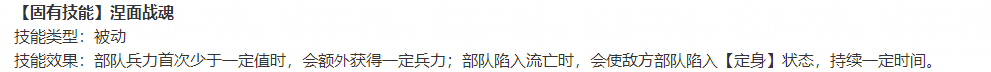 他的固有技能是涅面战魂,可以获得额外的兵力,而且部队陷入流亡时,会使敌方部队陷入【定身】。这个【定身】状态也是首次出现,他的定位就是一个肉盾+场控。作为纯肉的话,他可以和周亚夫组一队,再配合上周亚夫的锁血,军师可以选比如魏征之类带有【免伤】机制的,可以极大程度提升其坦度,在关键的地方一堵就是2、3分钟。此外,他也可以作为新自爆队的核心,在自爆之后还会给敌方施加一个定身状态,威慑力会比削弱前的周亚夫自爆更大。