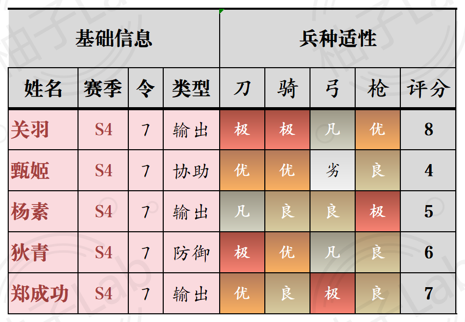 首先是我们的霸业武将关二爷。可以看到,他的兵种适性是刀兵极,骑兵极,弓兵凡,枪兵优。按照柚子自己的评分标准的话,关羽的兵种适性可以给到8分,在全部武将里属于顶尖水平,但是在霸业将中横向对比的话,就比较一般了。在四个赛季的所有武将中可以排到并列第五。新武将郑成功则可排到并列第10。