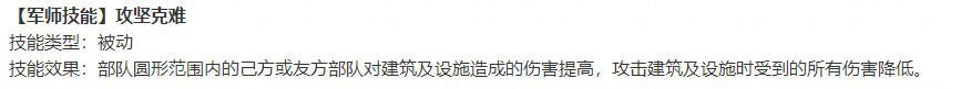 他的军师技是攻坚克难,是一个光环技能,也是王于的第三个光环类技能。这个技能是增加范围内友方部队的拆迁伤害,并降低建筑反伤。按爆料来看的话,器械是没办法吃到这个加成的,所以能用的只有给董卓军师的智力拆迁队提供增益了。当然,如果是器械也能吃到这个加成的话,那么攻城战,阵地战,以及关卡的作战就都需要专门安排人来提供光环了。