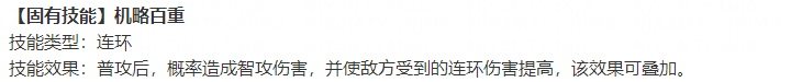他的固有技是机略百重,是一个智攻类连环技能。由于上赛季嬴政在实战中表现平平,所以猜测他的作用应该是给连击队的补强。从爆料的的数值来看的话,这个技能的伤害期望和部队增伤效果都还是不错的,新赛季有望和嬴政组成新的连环阵容,但同样的,如果玩双核连环枪的话,部队的生存依旧是个较大的问题。