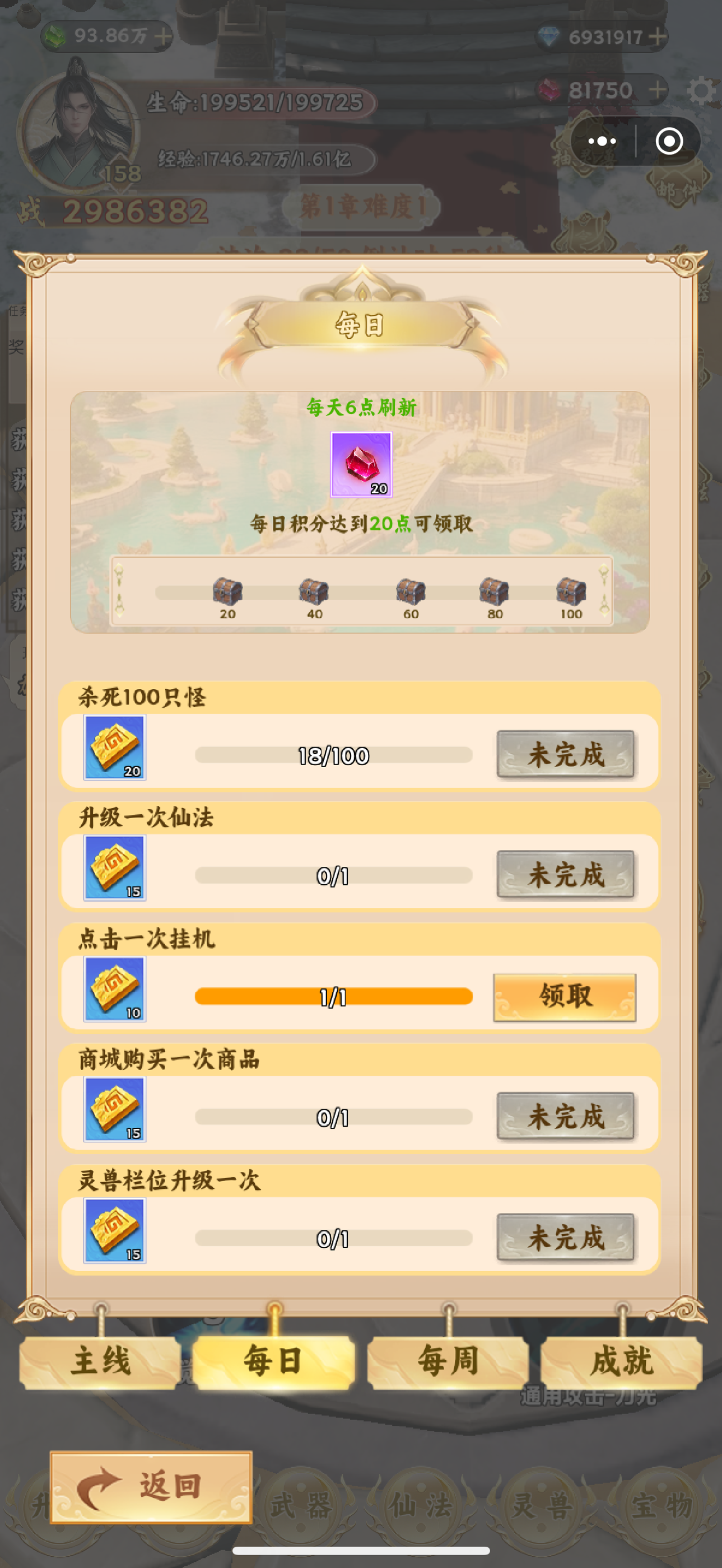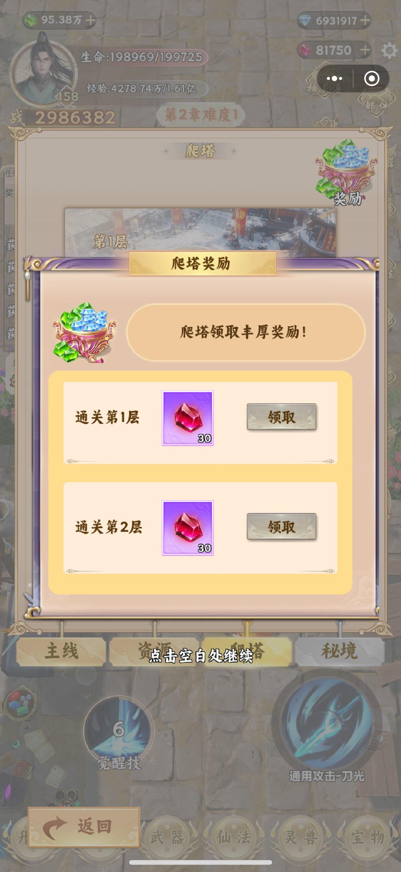 爬塔没有层数限制,每一层都有仙石奖励,战力提高后一定要利用好爬塔资源。