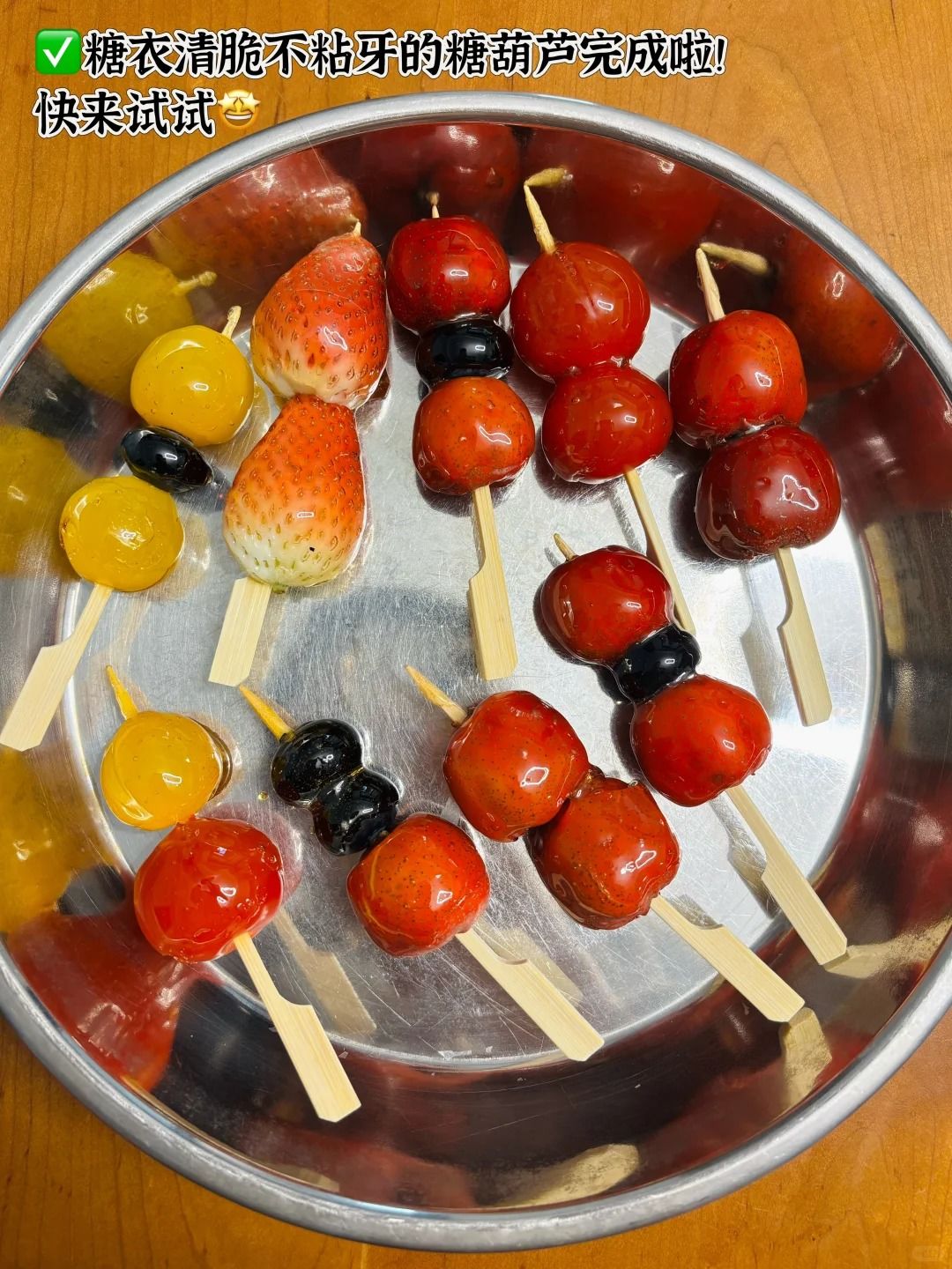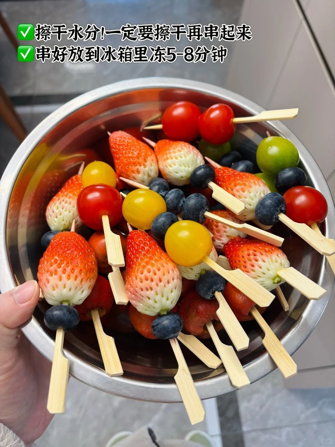 ✅水果尽量选带皮硬一点的类别好裹糖衣,洗干净后务必要擦干水分再串起来