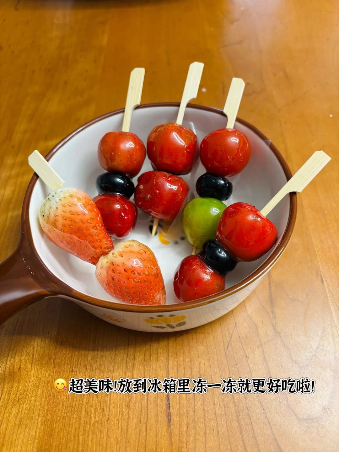 ⚠️水果串好后先冷冻5-8分钟,可以很好地防止水果在裹糖衣的时候烫破皮出水,从而导致糖衣融化!