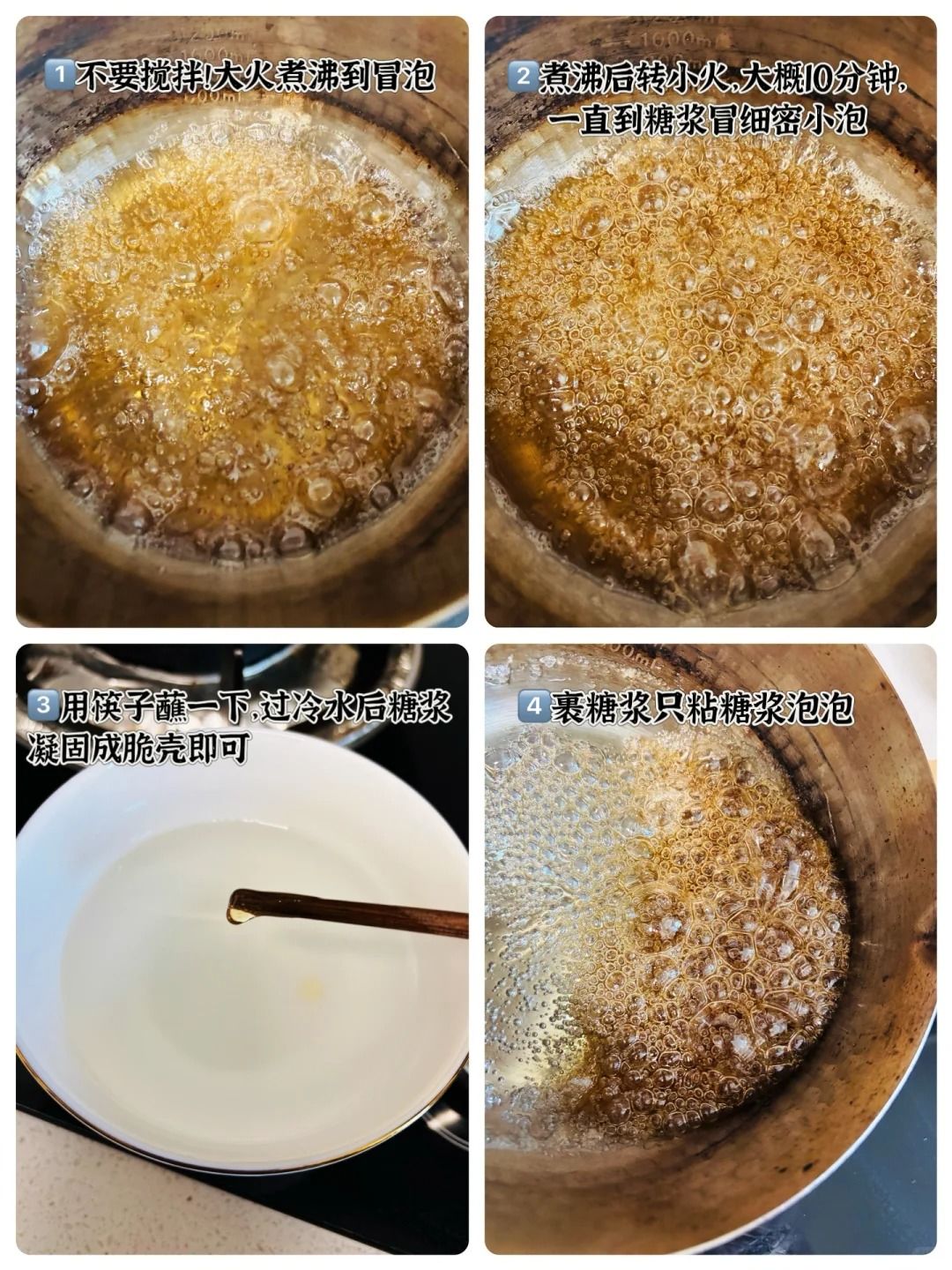 ⚠️注意火,糖不冒泡了就加热一下,冒泡泡就拿起来,千万不要让糖浆变成褐色会发苦!