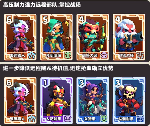 破碎猎人可搭配多个远程物攻手,形成独特的体系,利用其技能5,让这些远程单位以更快的频率投入战场,还能显著强化它们的基础属性从对局初期就对敌方展开疯狂压制,凭借高频率的远程火力与属性加成,牢牢掌控战场主动权,实现 “以远程火力碾压,速战速决抢血确立优势” 的战术目标。