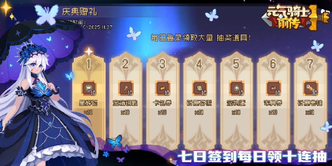 小骑士们好,游戏内七日签到今天开始啦,可从游戏【主菜单】-【周年庆典】-【庆典赠礼】处查看并领取哦!每天登录都可领取10连抽,错过可补签!