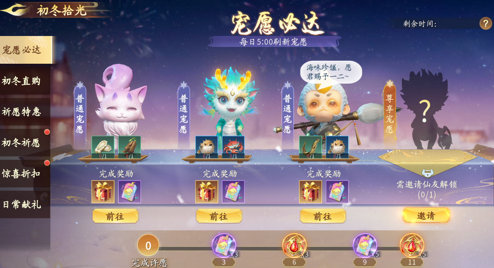 灵宠有心愿,主人来帮忙!灵宠们每日会派发4个愿望,其中尊享宠愿需要邀请仙友解锁,解锁后可刷新珍品甚至极品奖励!在特定地点钓鱼采药,或直接前往灵宠处购买提交即可完成愿望获得灵宠的回礼,累计完成一定数量的愿望还可获得如意符!