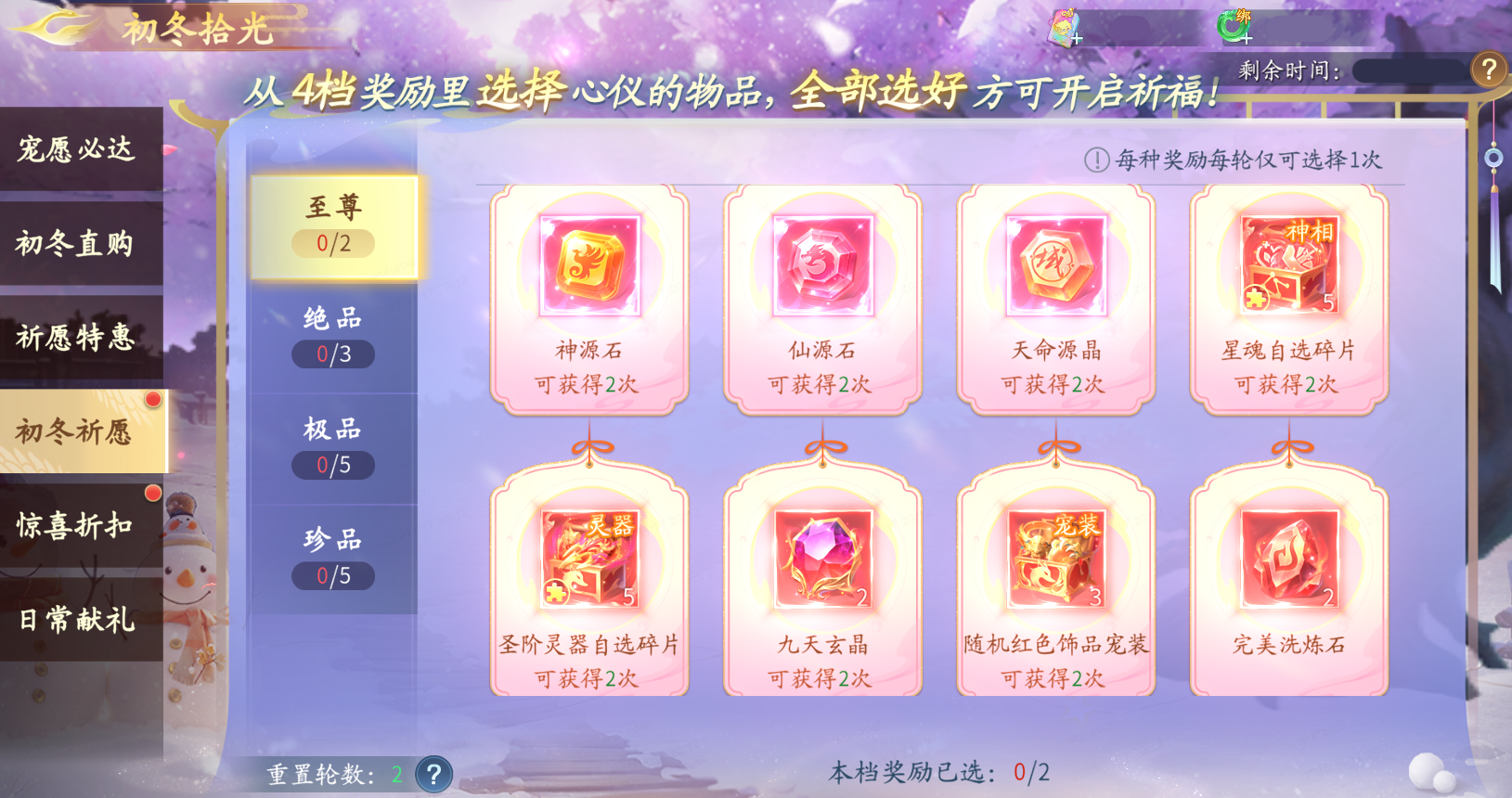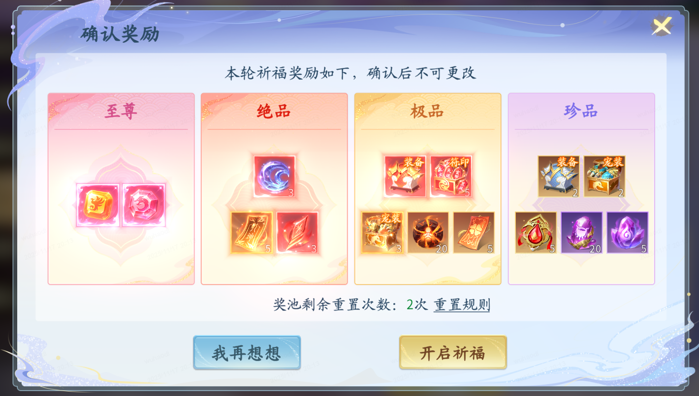 如意祈福好礼来,4档奖励随心选!消耗如意符进行祈福可得心选好礼,超多养成材料等你来享!获得当前所有奖励后可重置如意树,重新选择奖励开启新一轮祈福。活动首日可重置2轮,次日起每日额外增加1个重置轮数。