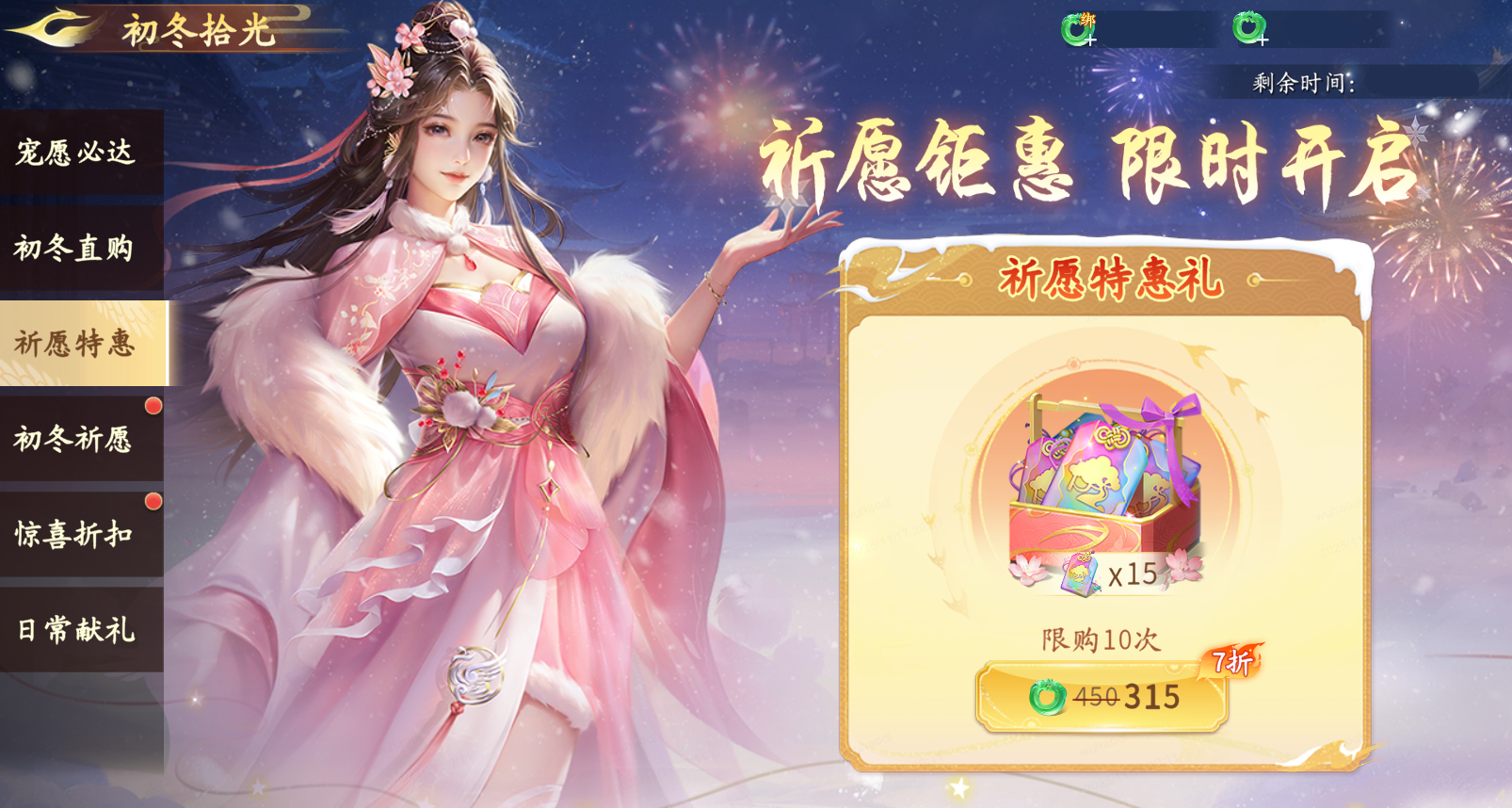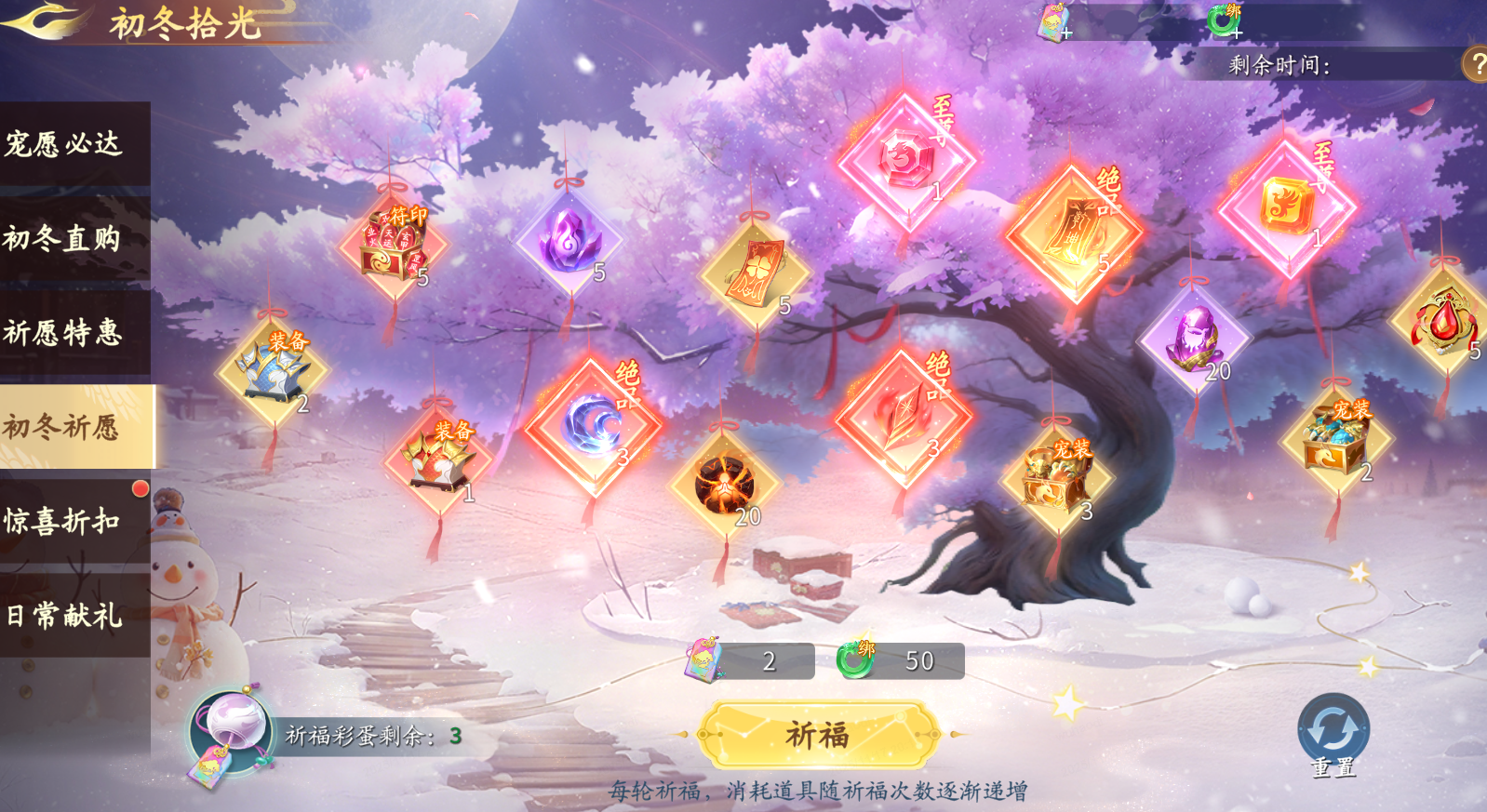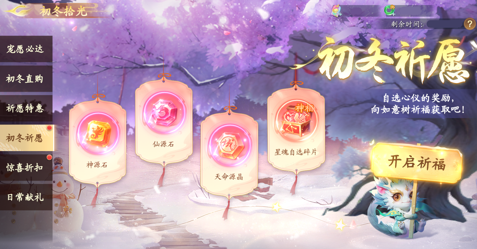 随着初冬第一场雪来临,如意树也迎来了新一轮的绽放!这次会给仙友们带来哪些惊喜好礼呢~11月21日5:00-11月24日5:00期间,前往【初冬拾光】活动即可参与祈愿,还有各种惊喜折扣等你来享~