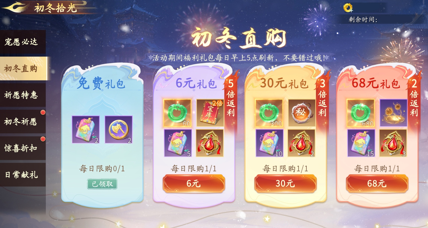 每日超值限购礼包,享受仙玉全返福利!还赠如意符和2倍宝库特权、困难秘境秘令等好礼!每日还有如意符和砍价币可领哦~