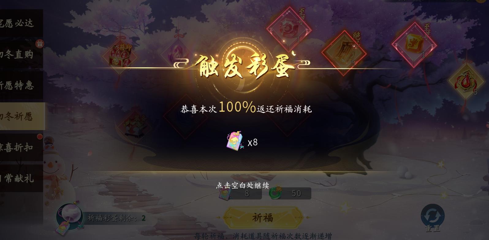 每轮祈福中,祈福消耗如意符数量会随祈福次数递增,但祈福会有概率触发祈福惊喜,返还一定比例的如意符。