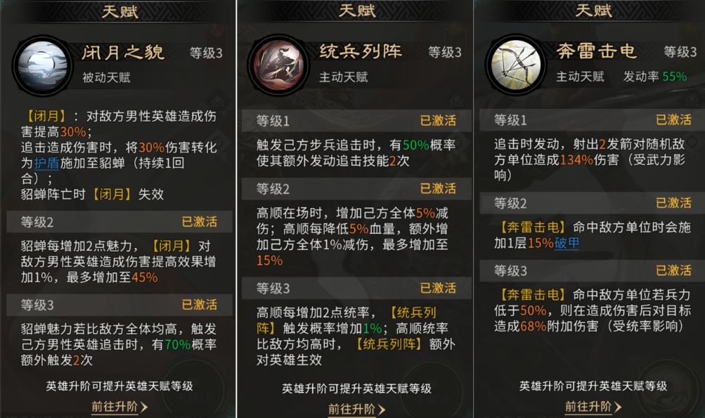 队伍思路为:貂蝉的天赋【闭月之貌】可为夏侯渊提供最高45%的增伤;若貂蝉魅力比敌方全体均高,还有概率让夏侯渊额外触发两次追击。高顺天赋【统兵列阵】效果类似,当其统帅属性占优时,也可为夏侯渊带来额外的两次追击机会。二者的辅助为夏侯渊的启动提供了“双重加速”。同时,高顺自身在频繁触发追击时可以触发天赋【奔雷击电】,也能快速积攒觉醒能量,觉醒后可造成高额输出。