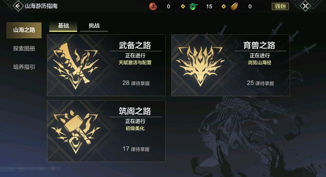 原来的山海之路,基于原有修炼之路、宠物之路、建造之路,进一步拆分为基础教学和挑战两部分,其中基础教学主要为旅者介绍角色培养、异兽养育、家园建设的基础操作和玩法内容,其中修炼之路、宠物之路为全新的任务内容,奖励不会继承之前进度,建造之路中部分任务会继承原任务进度,挑战内容则是为掌握基础玩法的旅者提供具有挑战性的内容来提升熟练度,一期内容为狩猎巨兽,即原巨兽之路。未来我们将会增加更多模块的内容,更完整地覆盖游戏系统和玩法~