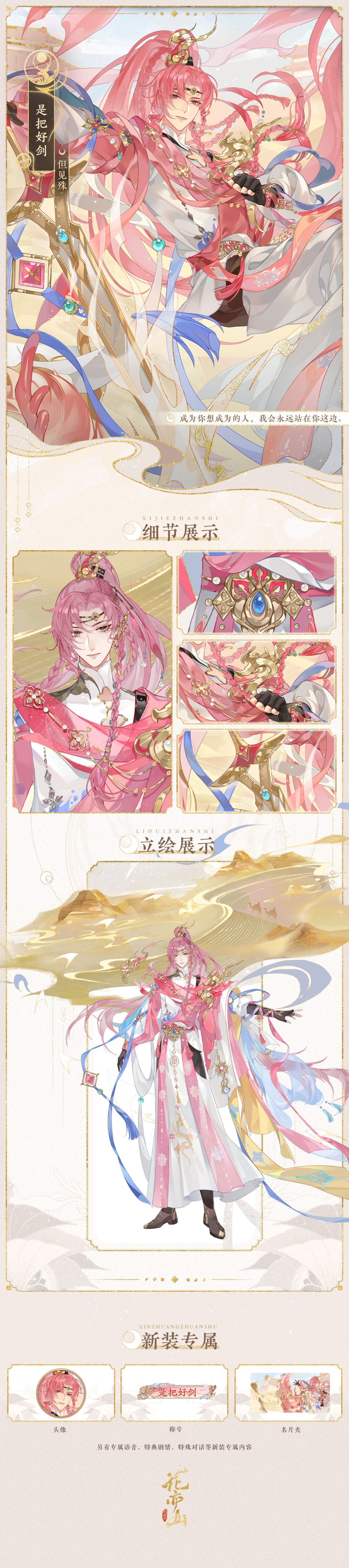 本次新装为【天工】品质,购买后可为名士穿戴新装,更换头像、全新立绘,解锁专属语音、特典剧情。同时【天工】品质新装还配备立绘背景、特殊对话、新装专属名片夹与称号。